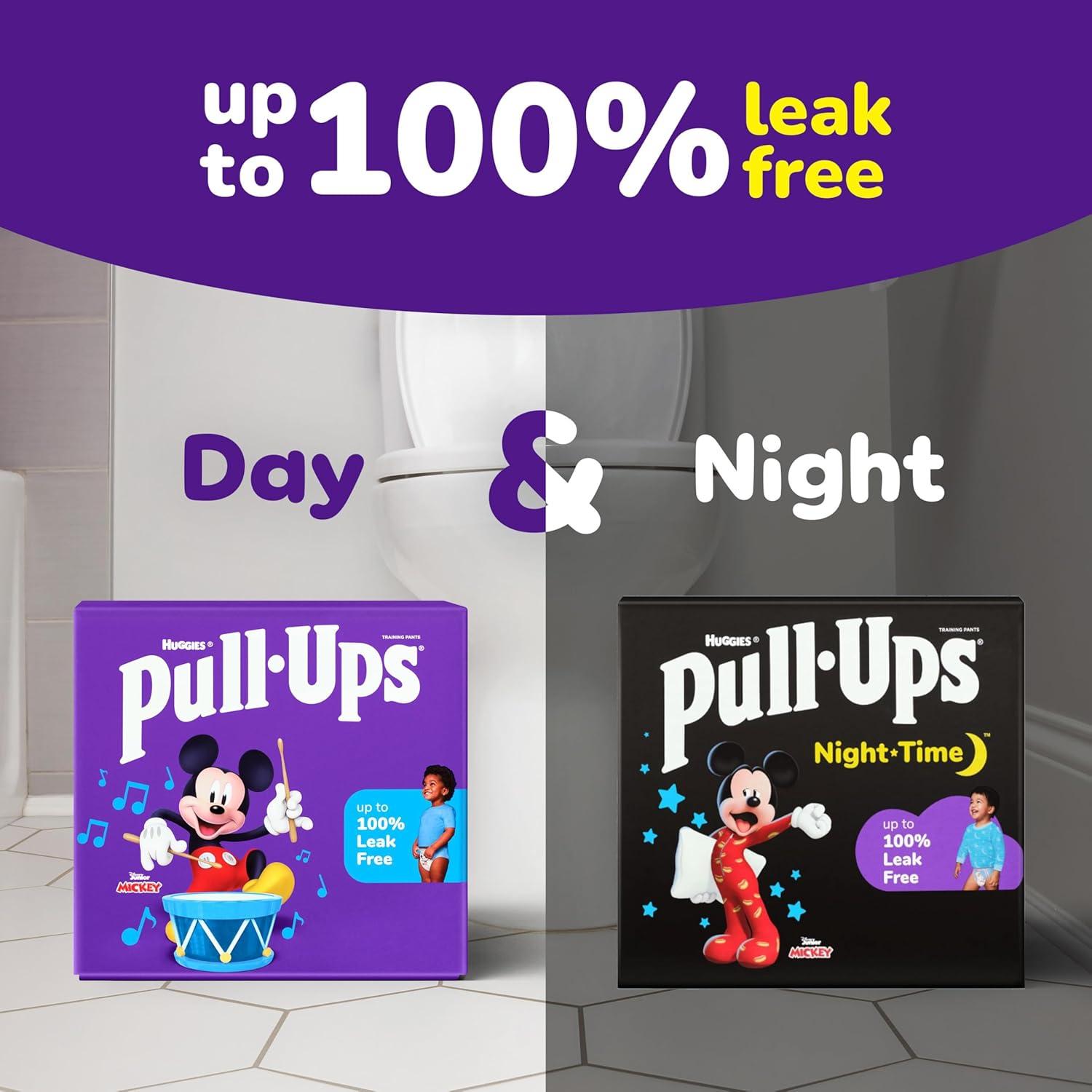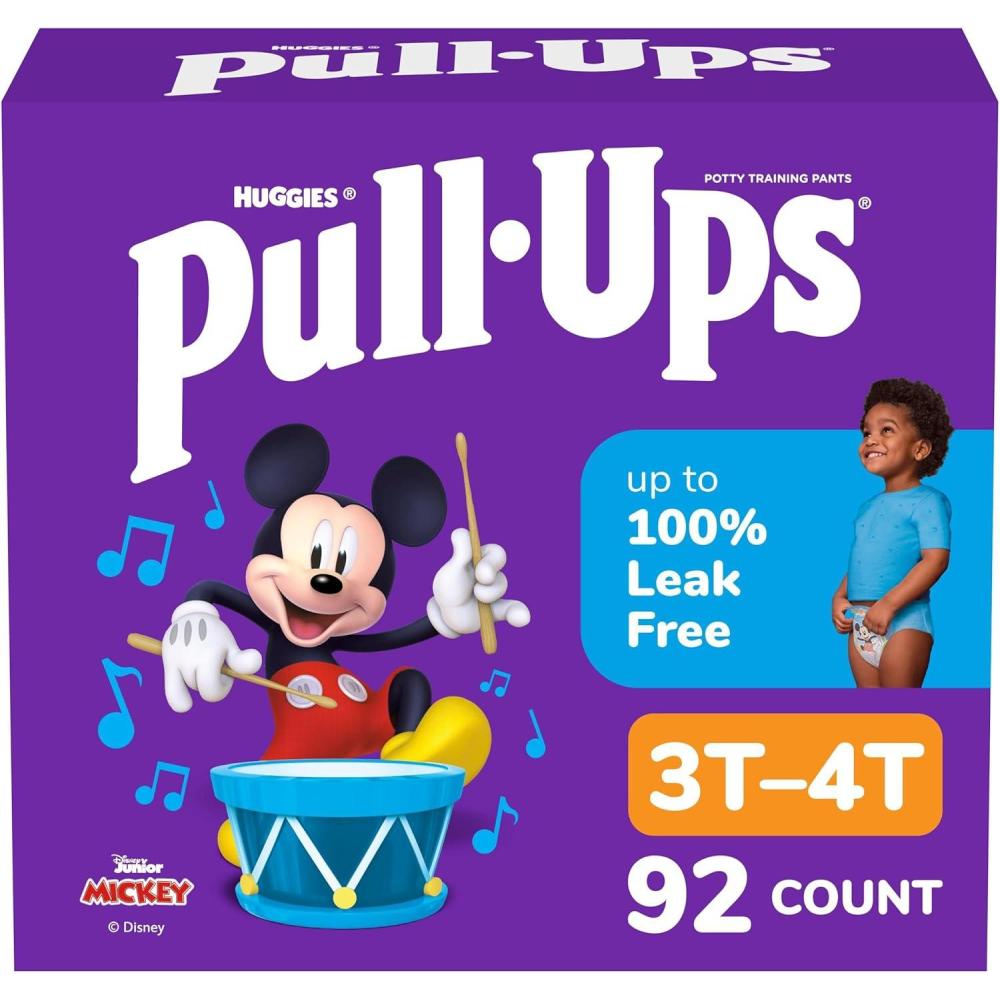 Build Big Kid confidence while potty-training with Pull-Ups Training Pants for Boys! Up to 100% leak free where boys need it most, Pull-Ups training pants back them up so misses don’t become messes! Designed with soft and breathable materials and a wide, stretchy waistband, Pull-Ups potty training underwear help your child be comfortable. To help foster Big Kid independence, these potty training underwear go up and down fast like undies, building Big Kid confidence as you potty train. Easy open, refastenable sides help to make changing the pull up quick and easy, even when you are on-the-go. These training pants also feature toddler loved designs from Disney’s Mickey Mouse. Only Pull-Ups has Disney designs to get your Big Kid pumped for potty training. Fading graphics help teach your Big Kid to stay dry. To help them stay motivated, tell your Big Kid a story that Mickey loves making music and you can help keep the music going by staying dry! When your child is ready to begin his potty training journey, the Pull-Ups brand can help. Visit the Pull-Ups website for expert potty training tips and resources. We’ve helped train 60 million Big Kids and counting!* Pull-Ups Boys Training Underwear are available in sizes 2T-3T (16-34 lbs), 3T-4T (32-40 lbs), 4T-5T (38-50 lbs) and 5T-6T (50+ lbs). (*US and CA)